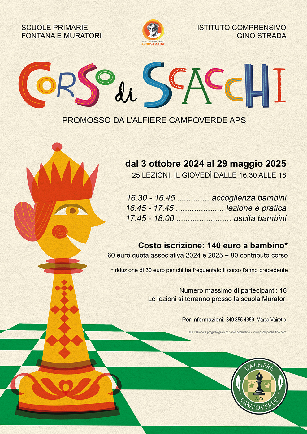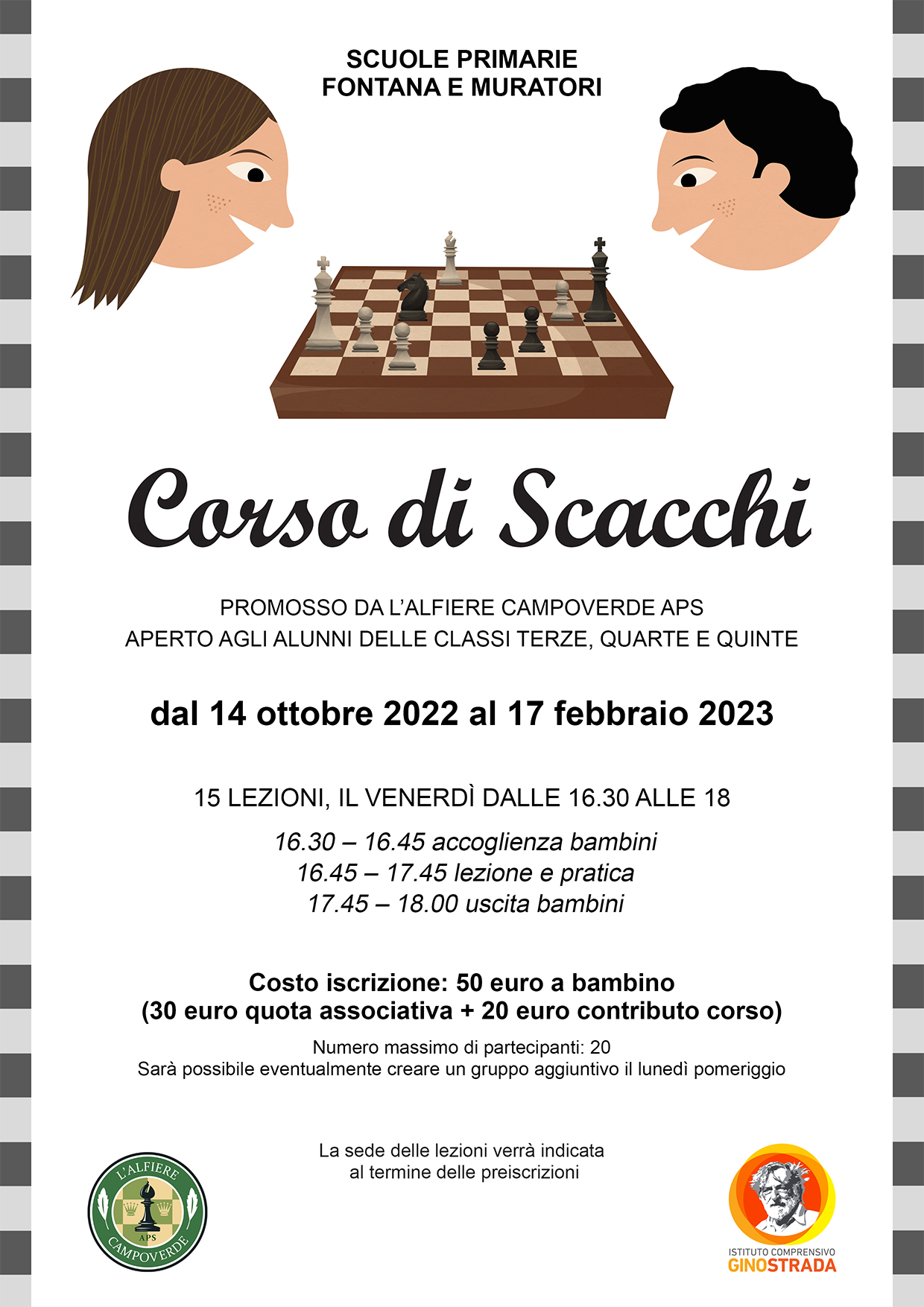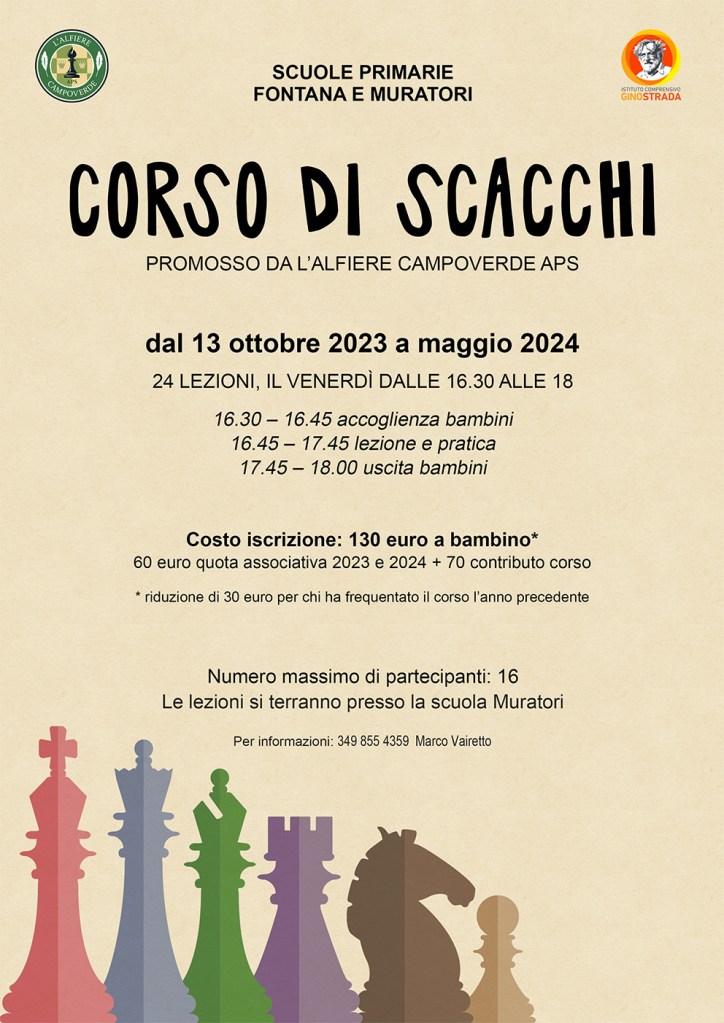 19 settembre 2024: il 3 ottobre, presso la Scuola Primaria Muratori, facente parte dell’Istituto Comprensivo Gino Strada, inizierà il nuovo Corso di Scacchi organizzato da L’Alfiere Campoverde e arrivato alla sua terza edizione.