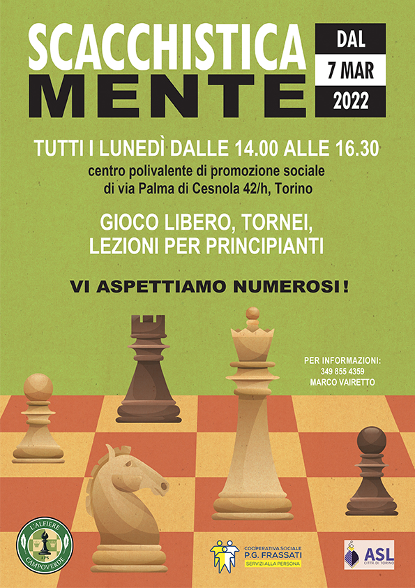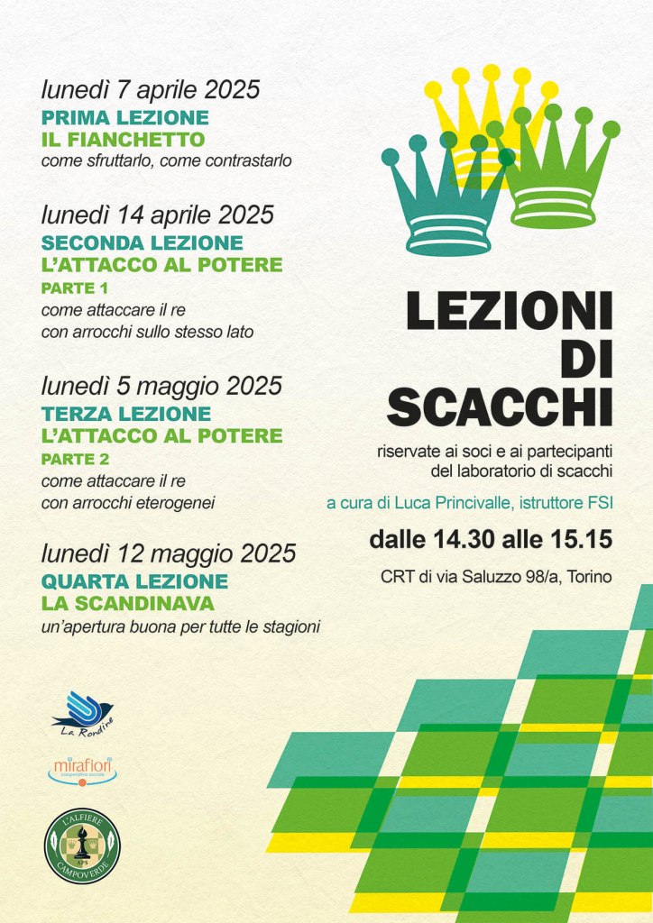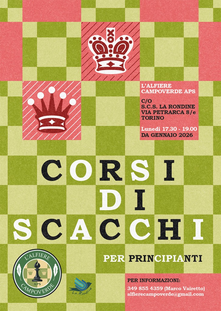31 marzo 2025: sta per iniziare un nuovo ciclo di lezioni gratuite offerte da L’Alfiere Campoverde ai propri soci e a tutti i partecipanti del laboratorio di Scacchi che ogni lunedì si tiene presso il CRT “Giorgio Bisacco” di via Saluzzo 98/a.