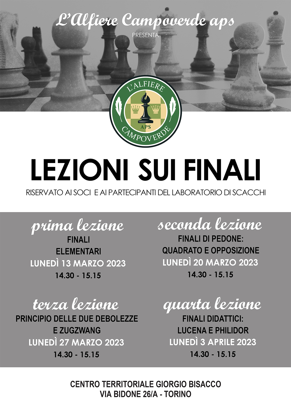 13 marzo 2023: dopo il ciclo di lezioni sulle aperture e quello sul mediogioco, dove abbiamo affrontato elementi di tattica e di strategia, è la volta di quattro lezioni sui finali. Si partirà sicuramente presso il Centro Territoriale Bisacco di via Bidone 26/a, ma non appena ci saranno di nuovo le condizioni per utilizzarne gli spazi, gli incontri del lunedì torneranno a svolgersi presso il Centro Polivalente di Promozione Sociale di via Palma di Cesnola 42/h.