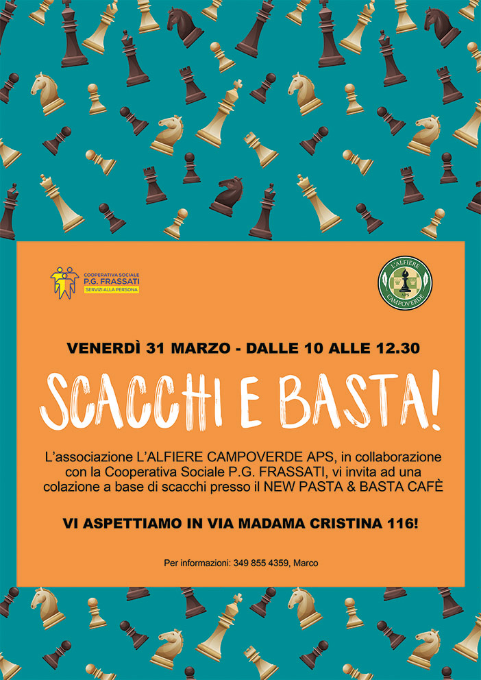 31 marzo 2023: dopo sole tre settimane dall’appuntamento presso il Bistrot Mazag di via Bidone, gli Alfieri proseguono le loro escursioni e propongono, a chiunque voglia partecipare, una colazione scacchistica presso il NEW PASTA & BASTA CAFÈ di via Madama Cristina 116.
