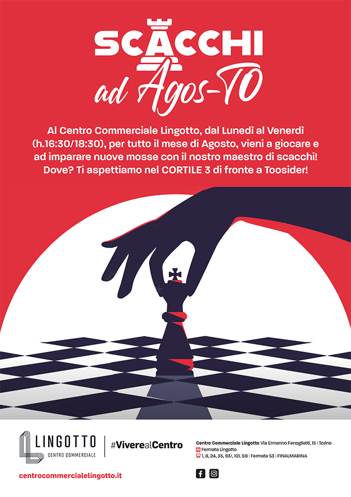 Per tutto agosto, grazie alla collaborazione tra la Società Scacchistica Torinese e il Libero Torneificio del Borgo, sarà possibile, per tutti gli appassionati e per chi vuole iniziare, giocare a scacchi all’interno del centro commerciale Lingotto, dove, nella piazza adiacente al Cinema Multisala tutti i pomeriggi, esclusi i week end, sarà presente un Candidato Maestro in qualità di animatore.