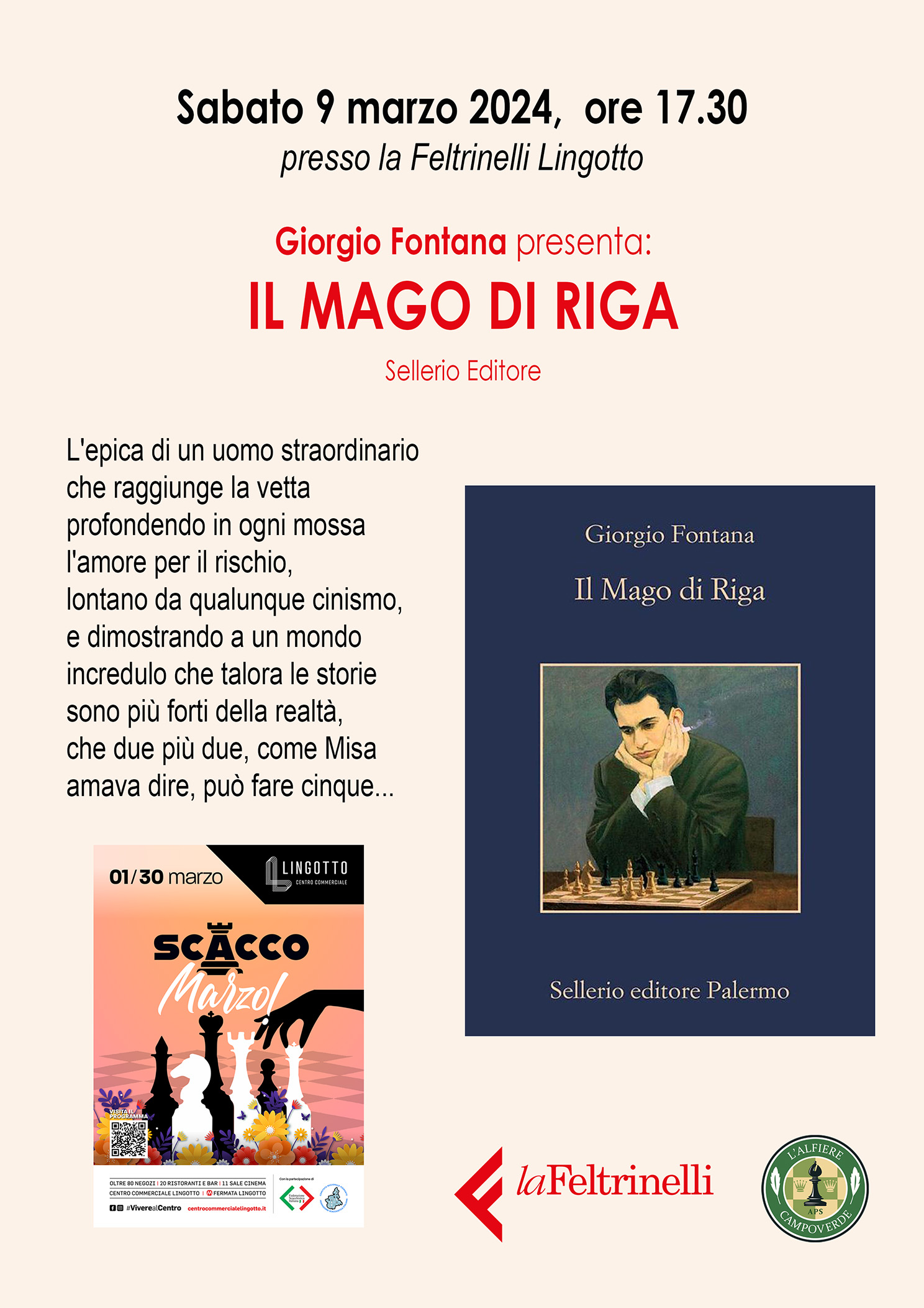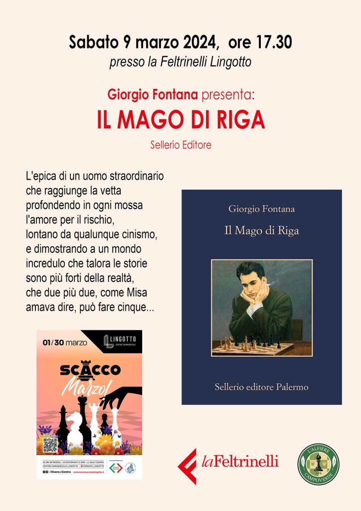 Alle 17.30, presso la libreria Feltrinelli ci sarà la presentazione del libro a tema scacchistico IL MAGO DI RIGA con l’autore Giorgio Fontana. Vi aspettiamo!