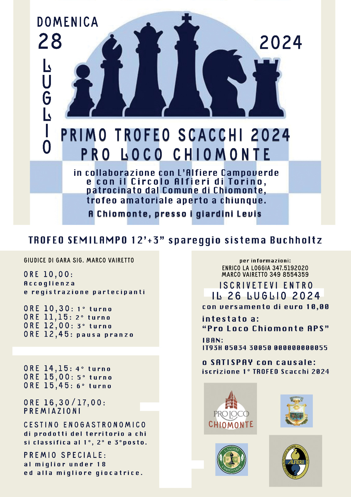 28 luglio 2024: L’Alfiere Campoverde, su invito della Pro Loco di Chiomonte organizza un trofeo amatoriale aperto a tutti, con formula semilampo 12’+3″ e spareggio sistema Buchholtz.