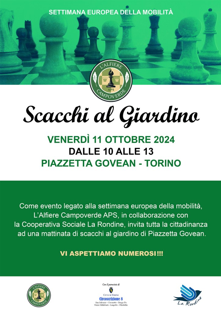 11 ottobre 2024: in occasione della Settimana Europea della Mobilità, ci si troverà presso il giardino di Piazzetta Govean (dove la nostra associazione è nata nel 2021!) per una mattinata di scacchi.