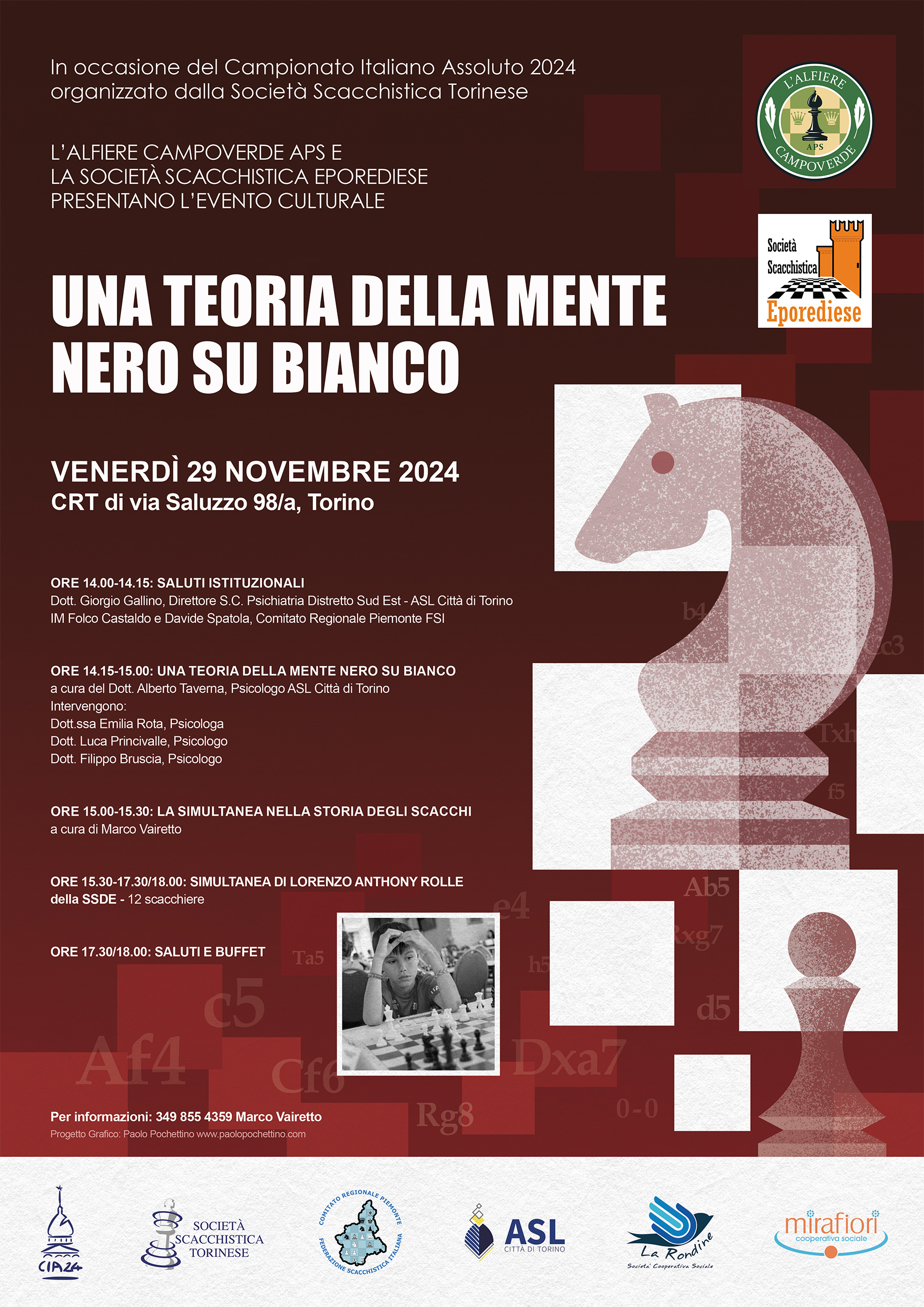 in occasione del Campionato Italiano Assoluto 2024, organizzato dalla Società Scacchistica Torinese, presenteremo l’evento culturale UNA TEORIA DELLA MENTE NERO SU BIANCO. Dopo i saluti istituzionali ci sarà una piccola conferenza sui benefici mentali derivanti dalla pratica scacchistica, quindi, a seguire, una breve analisi storica introdurrà la partita simultanea del giovanissimo talento della SSDE Lorenzo Anthony Rolle, che affronterà 12 avversari contemporaneamente.