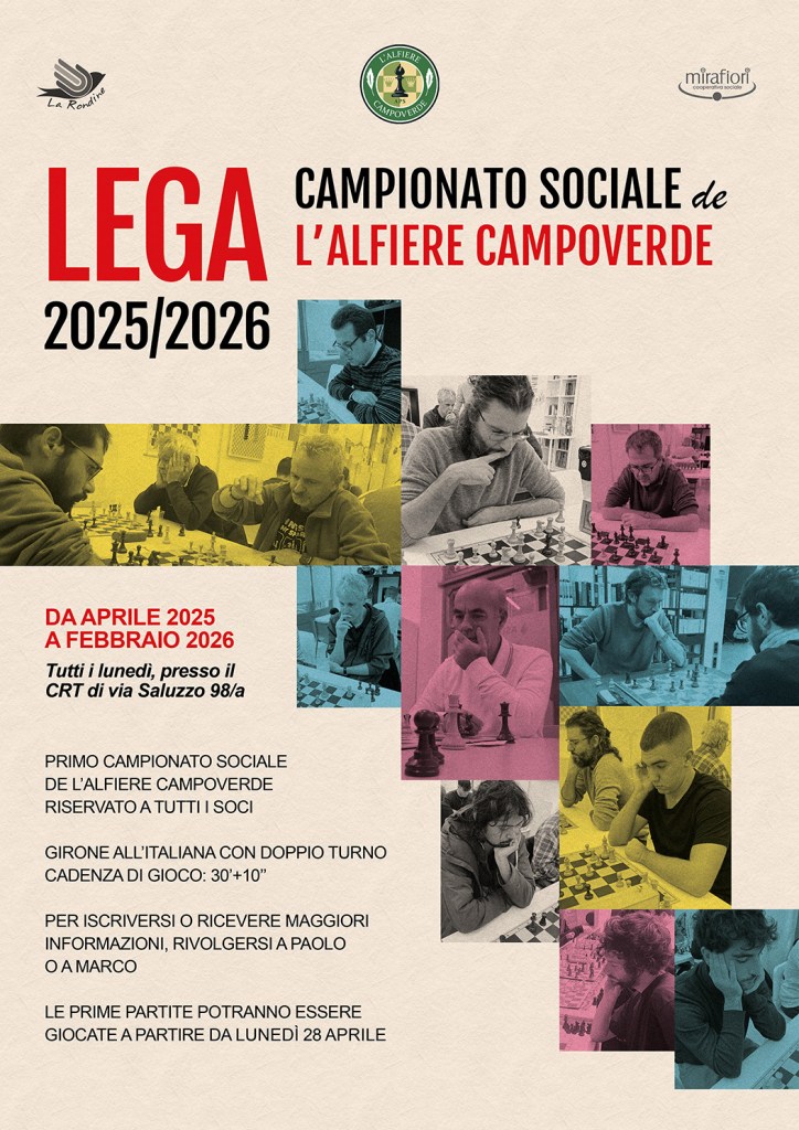 24 aprile 2025: nuova iniziativa della nostra associazione: a partire da lunedì 28 aprile inizieranno gli incontri della Lega 2025/2026, il Campionato Sociale de L’Alfiere Campoverde, che nel giro di un anno vedrà una buona parte dei soci sfidarsi l’un l’altro in un torneo all’italiana con doppio turno. Si giocheranno le partite a seconda delle disponibilità degli sfidanti senza particolari vincoli, se non completare tutti gli incontri entro aprile 2026.