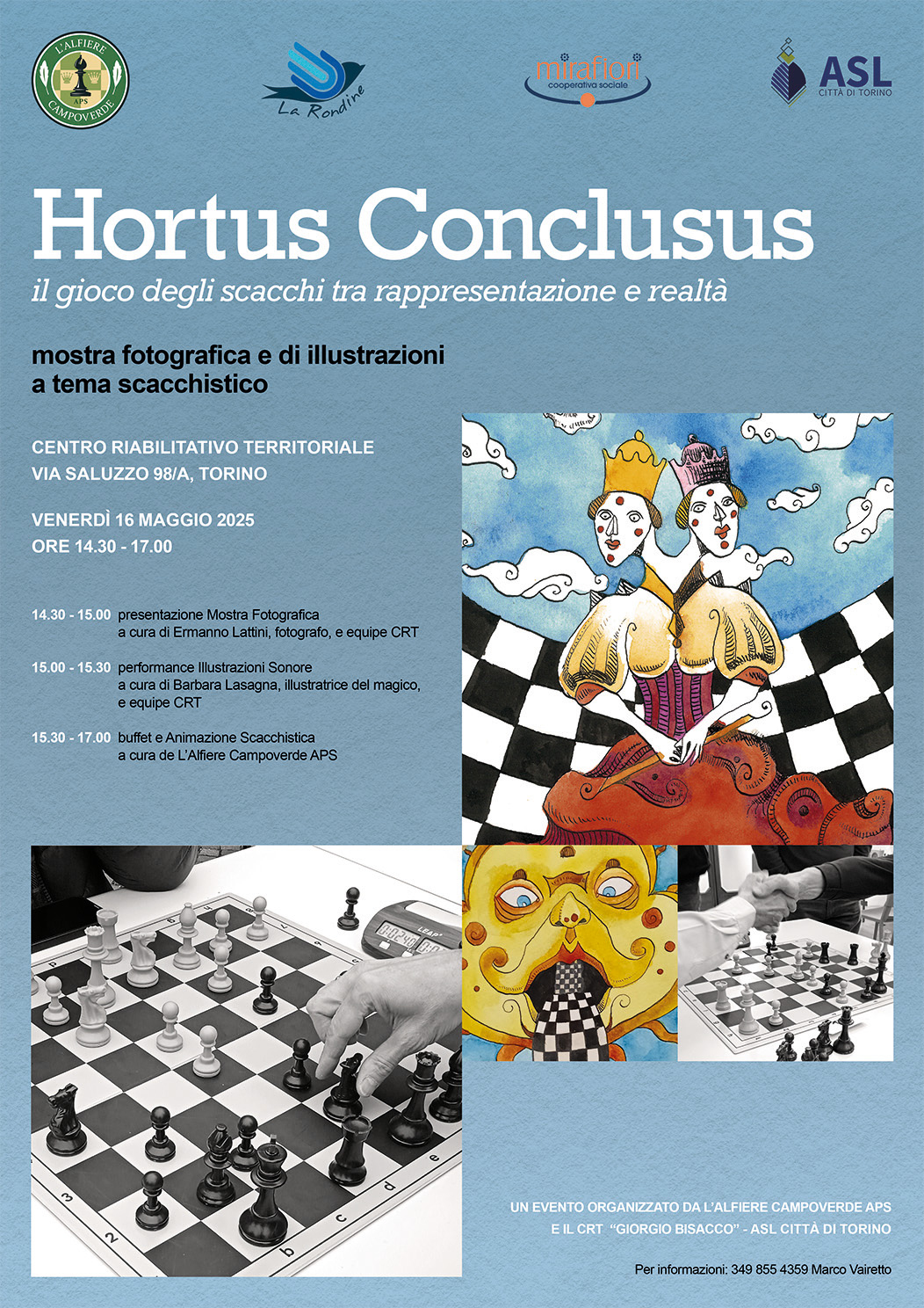 8 maggio 2025: L’Alfiere Campoverde, in collaborazione con il Centro Riabilitativo Territoriale “Giorgio Bisacco” invita tutta la cittadinanza a partecipare venerdì 16 maggio, alle ore 14.30, all’inaugurazione della mostra fotografica e di illustrazioni HORTUS CONCLUSUS – Il gioco degli scacchi tra rappresentazione e realtà. Con le fotografie di Ermanno Lattini e le illustrazioni sonore di Barbara Lasagna.