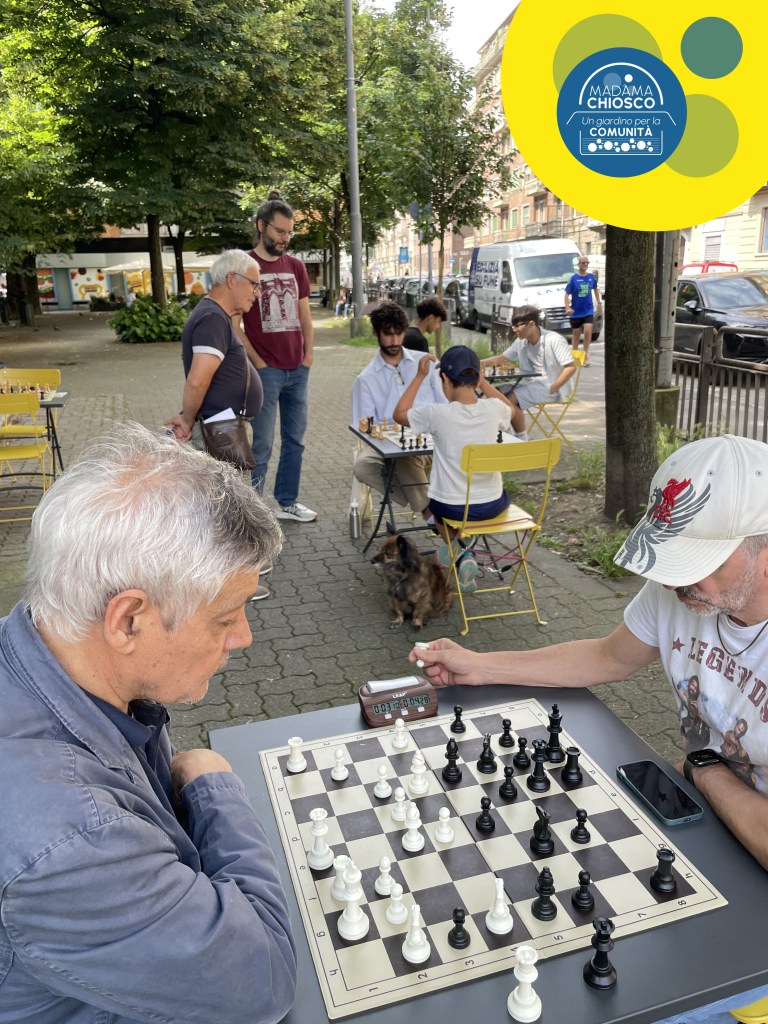 5 maggio 2025: torna l’attività scacchistica de L’Alfiere Campoverde al Giardino Anglesio (angolo Corso Dante/via Madama Cristina). Nasce infatti il progetto Madama Chiosco (evoluzione del progetto Madama – Giotto: Spazio attivo, di cui già facevamo parte) che con i fondi ottenuti grazie al bando Impat-TO e alla collaborazione tra diverse associazioni (oltre a noi: AGS – Associazione Giovani Salesiani, LAQUP – Laboratorio Qualità Urbana e Partecipazione, Agenzia per lo sviluppo locale di San Salvario ETS e Associazione Commercianti Madama Cristina) si occuperà di organizzare per la durata di due anni diverse attività sociali in questa piccola area verde di Torino per renderla sempre più uno spazio di aggregazione e partecipazione per tutta la comunità.