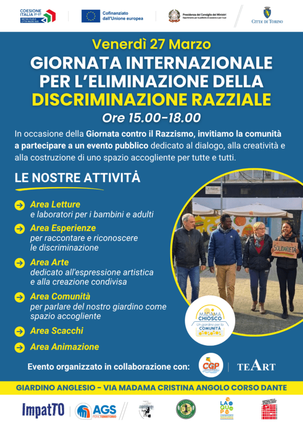 27 marzo 2026: in occasione della Giornata internazionale per l’eliminazione della discriminazione razziale, il consueto nostro appuntamento del venerdì mattina al Giardino Anglesio, sarà posticipato al pomeriggio, dalle 15 alle 18.